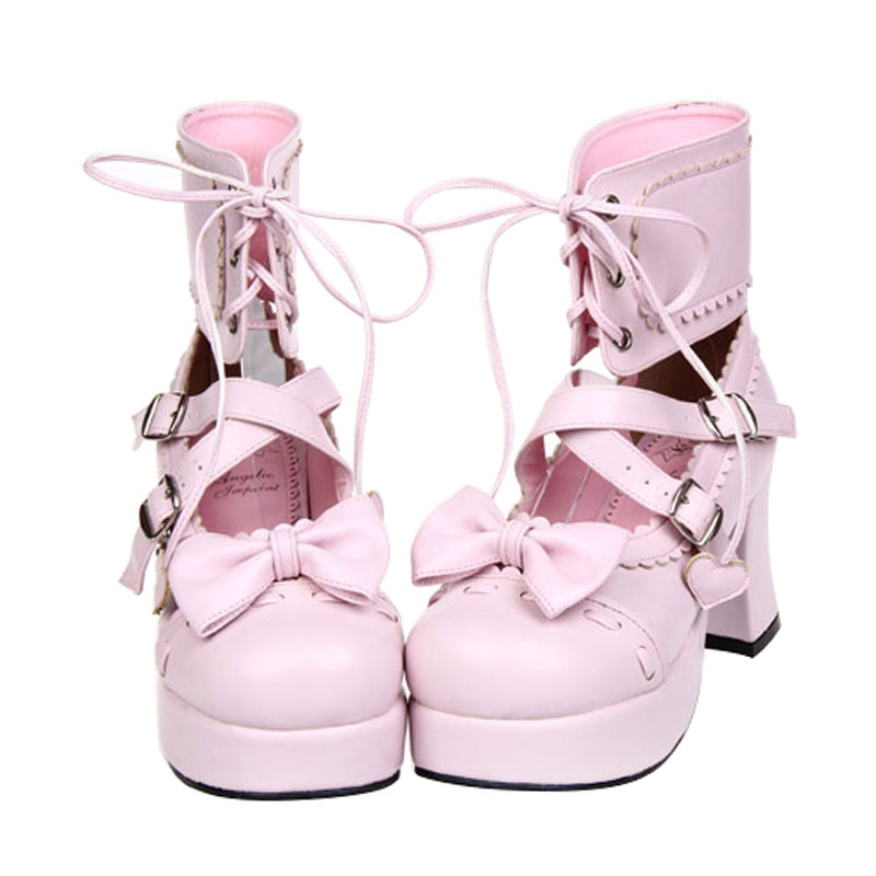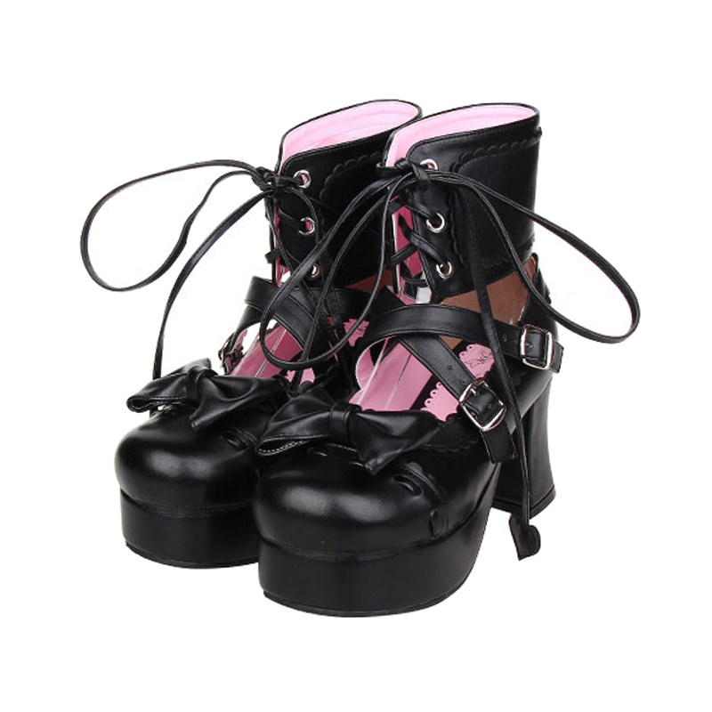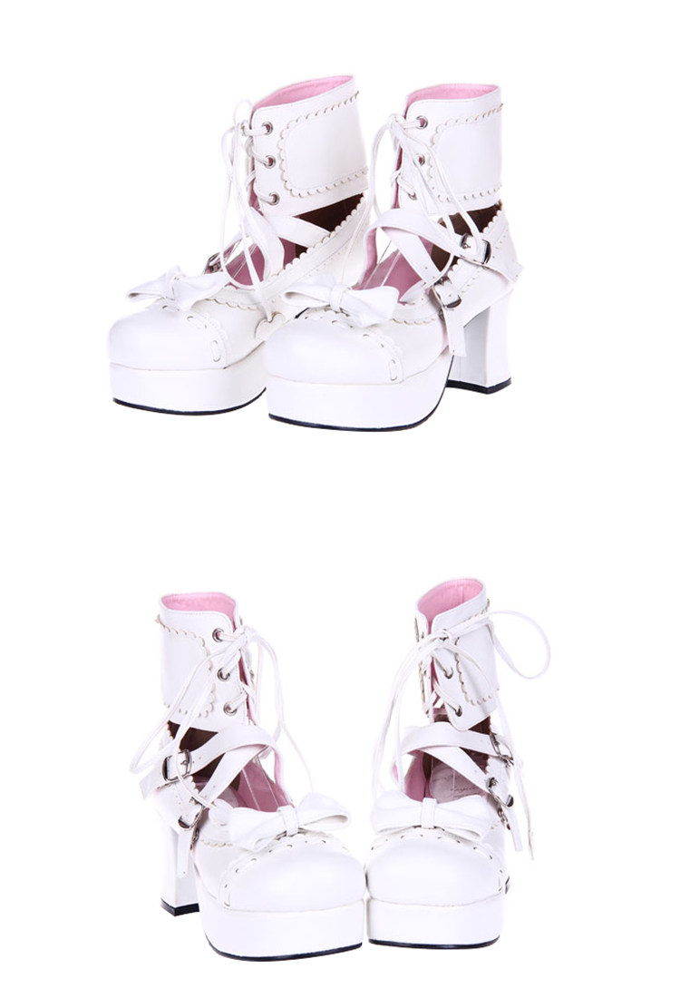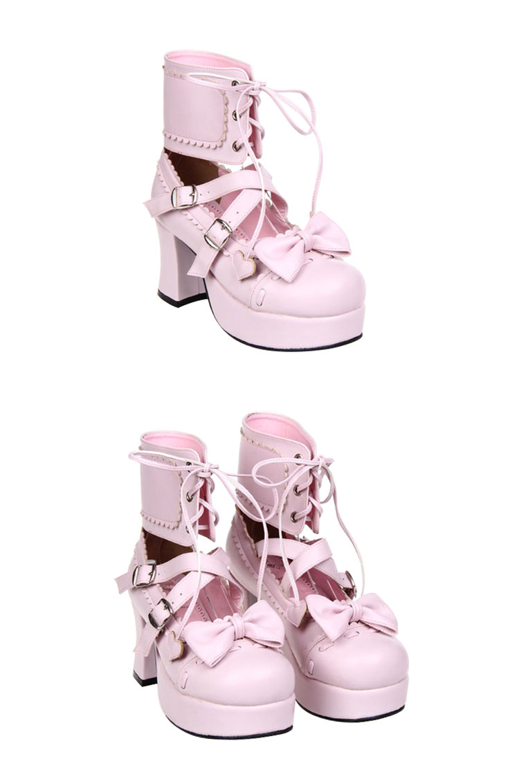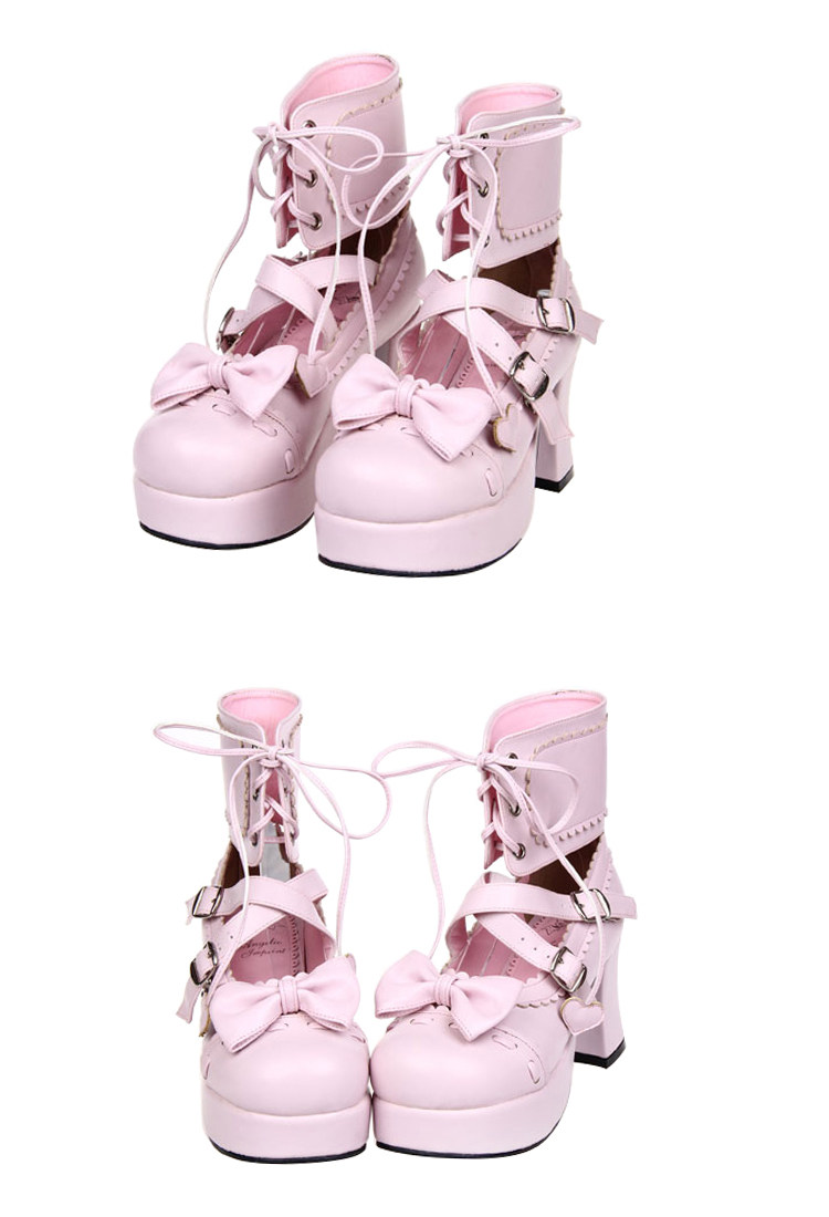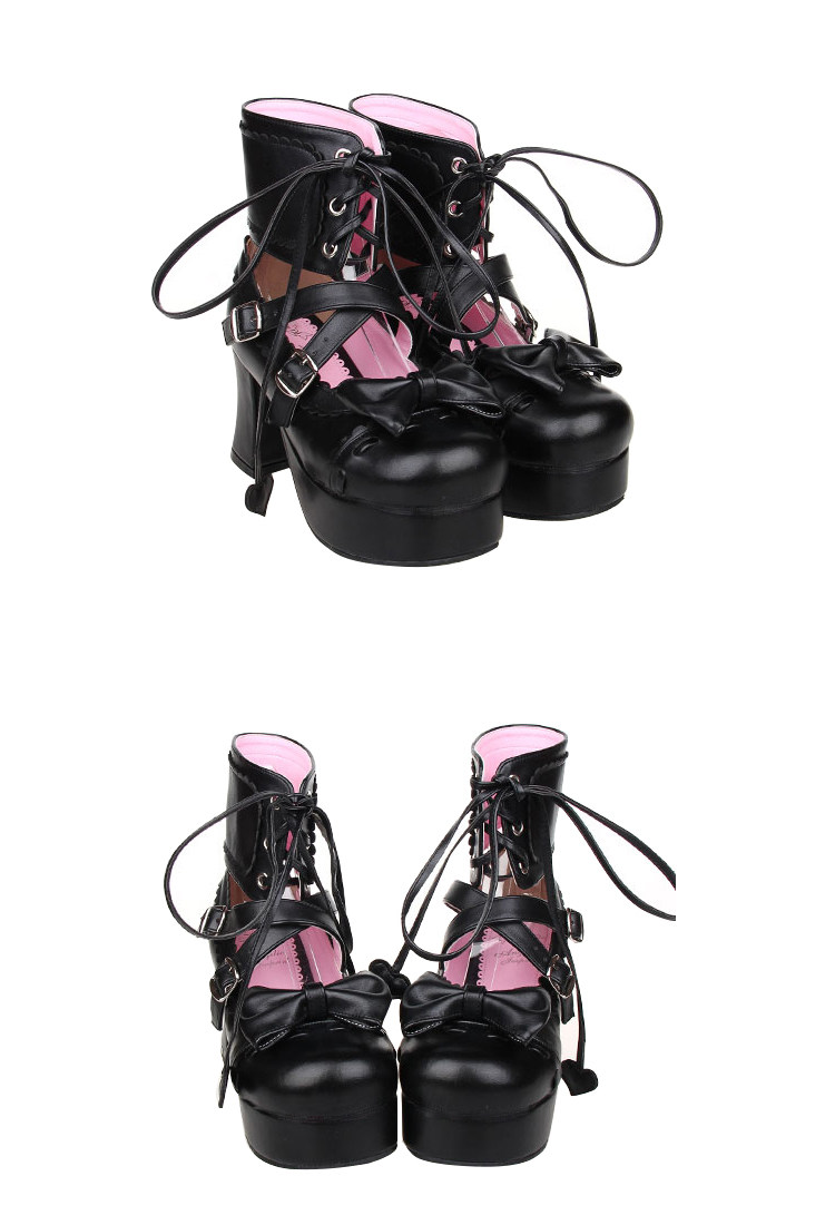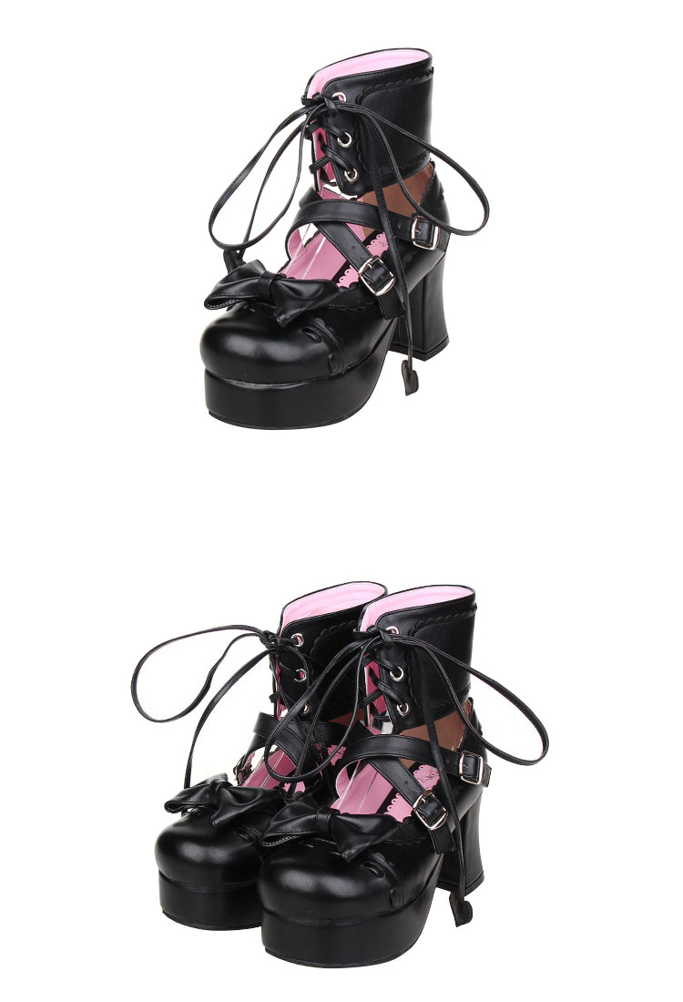 足首まで包み込む編み上げデザインと、つま先の愛らしいリボンが特徴的で、甘さと辛さを兼ね備えたスタイルを演出します。