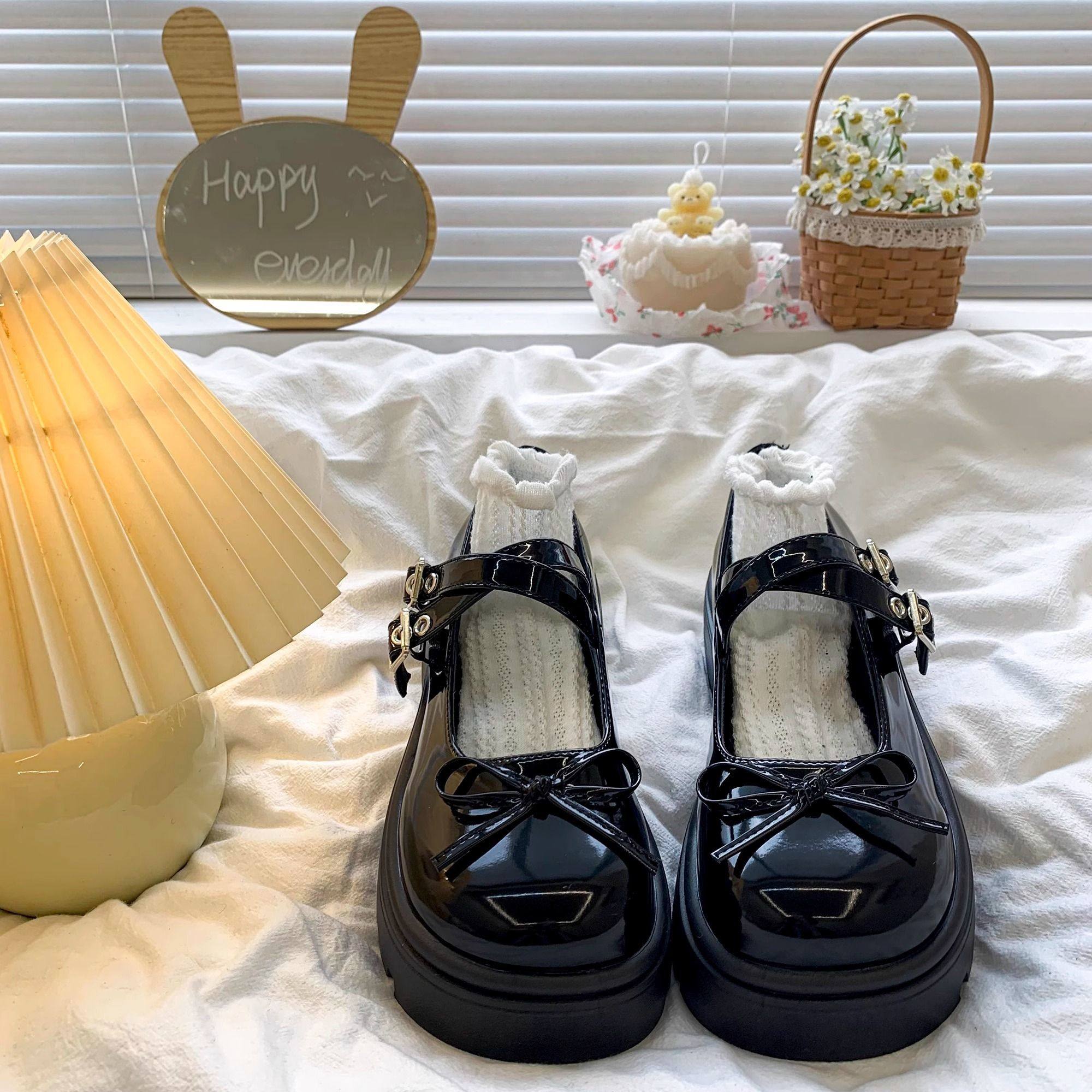 つま先の愛らしいリボンとストラップの二連バックルがアクセントになり、足元を華やかに演出します。