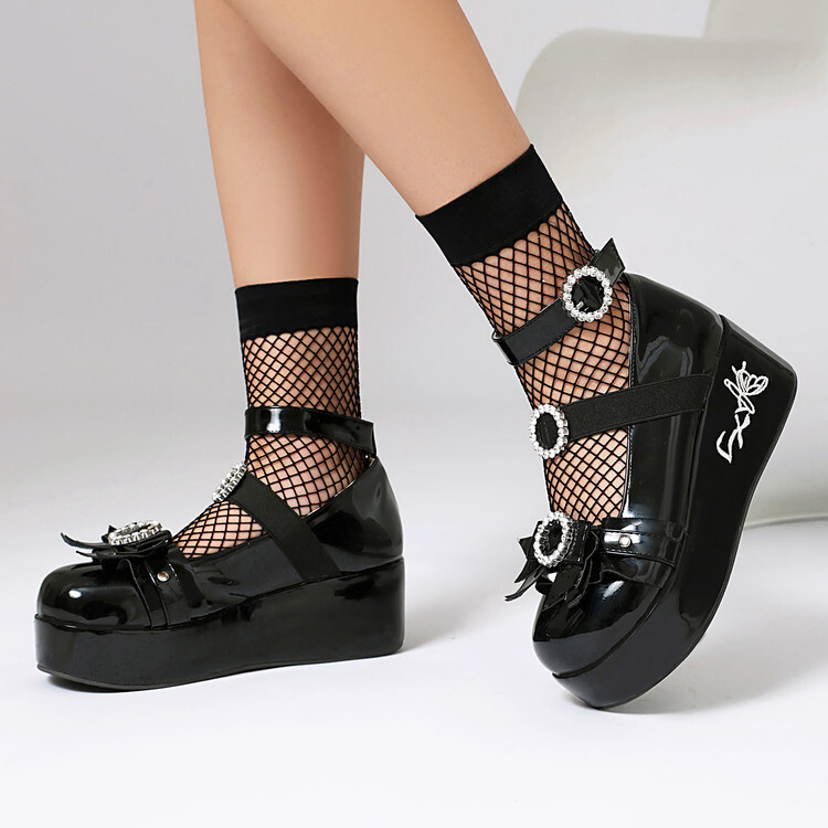 華やかなリボンと宝石風バックルが目を引く、個性的なデザインの厚底ブーツです。 光沢のあるエナメル素材が高級感を演出し、ボリュームのある厚底ソールでスタイルアップ効果も抜群。 甲部分を飾る複数のバックルストラップが、足元に華やかさとアクセントを加えます。 個性的なファッションを楽しみたい方におすすめの一足です。