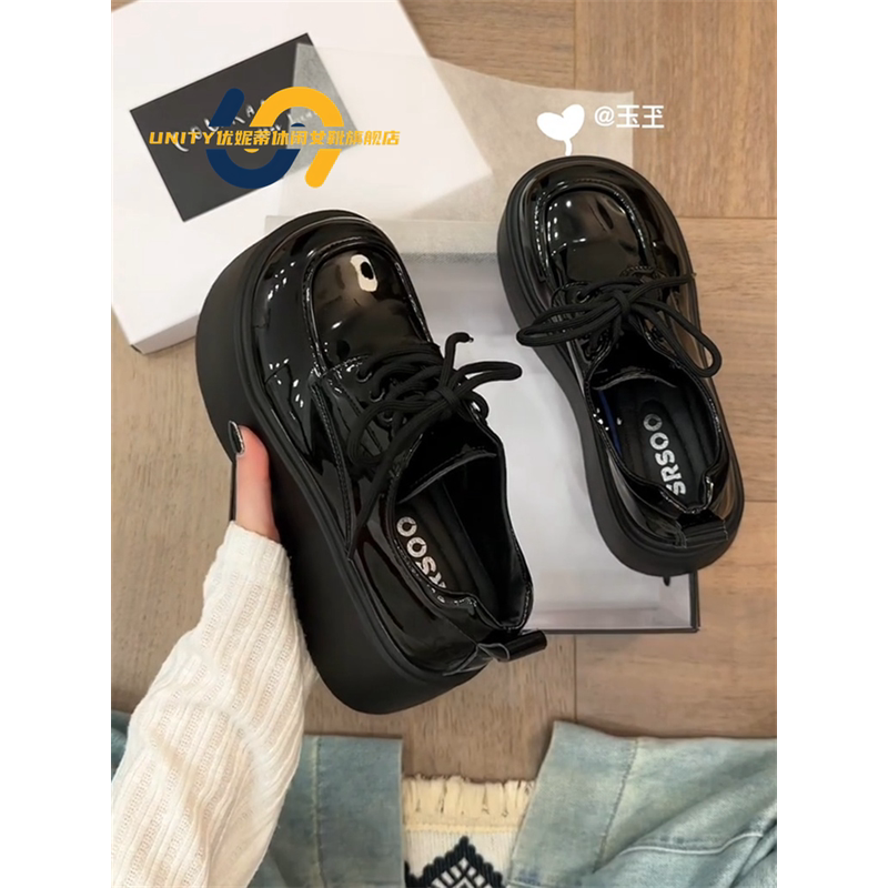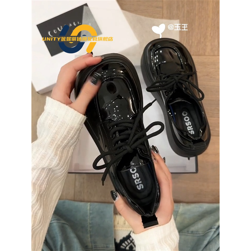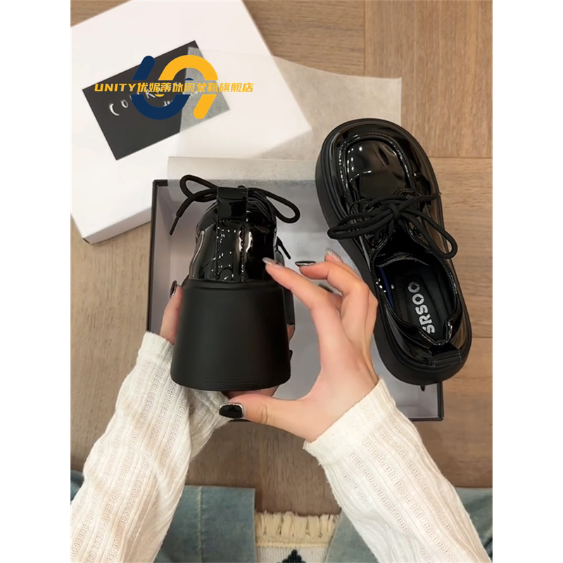 艶やかなエナメル調の素材が目を引く、モダンなデザインの厚底ローファーです。