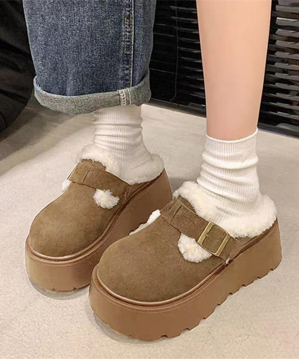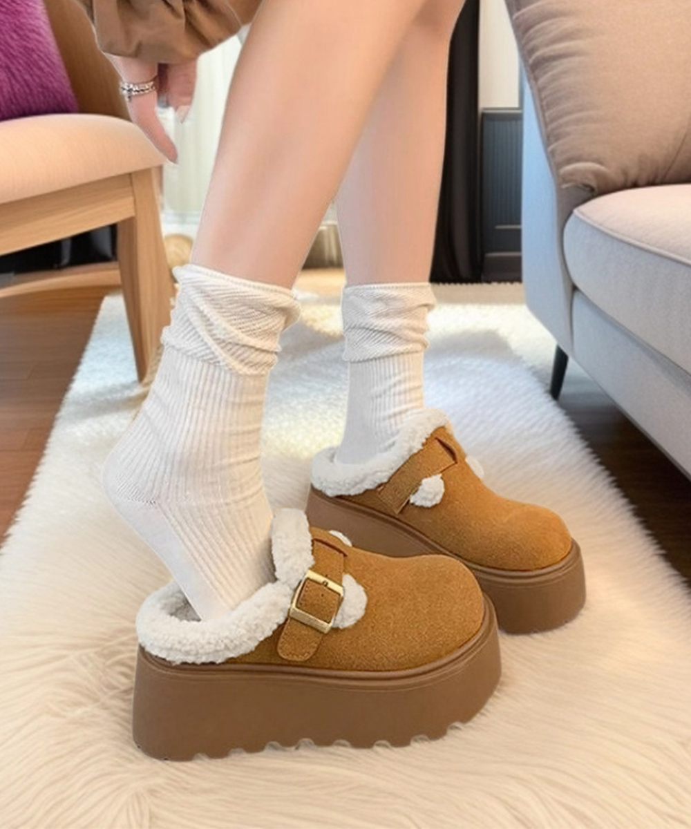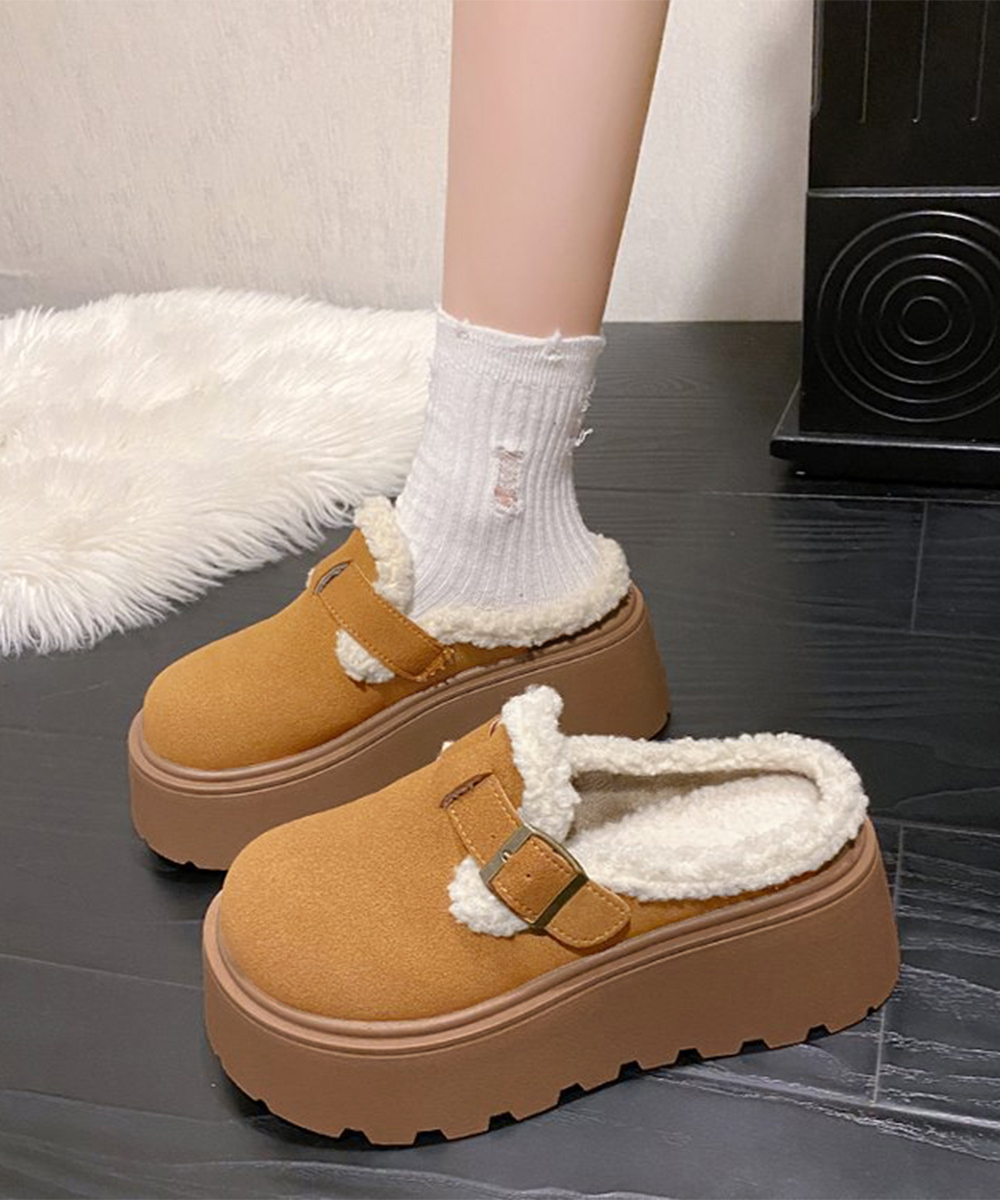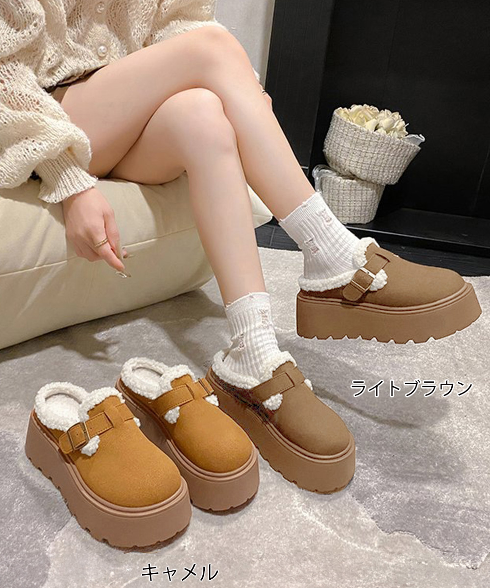 ふわふわのボア素材が足元を暖かく包み込む、厚底サボサンダル。