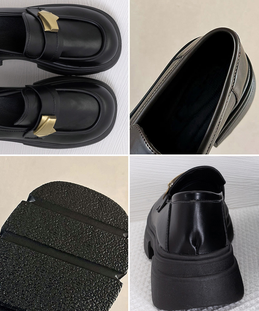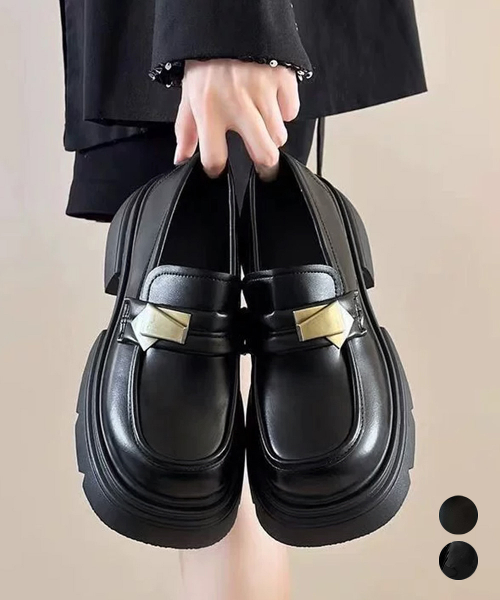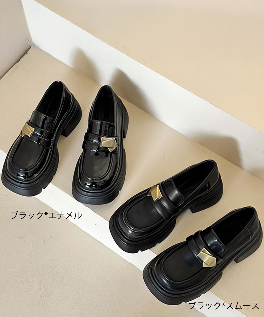 ボリューム感のある厚底ソールと金属装飾が映える学生風ローファー。