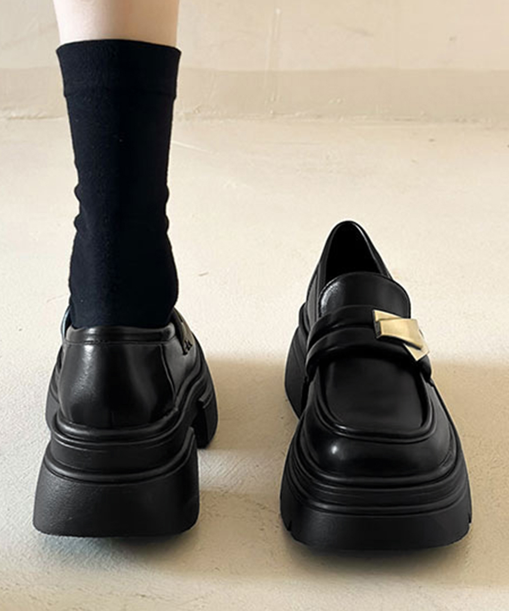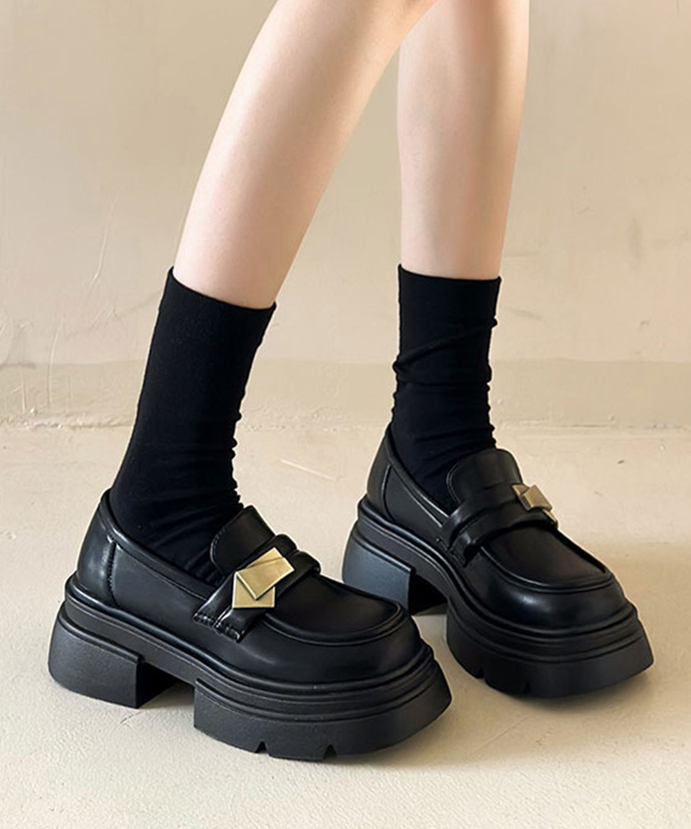 ボリューム感のある厚底ソールと、メタルモチーフが映えるローファーシューズ。