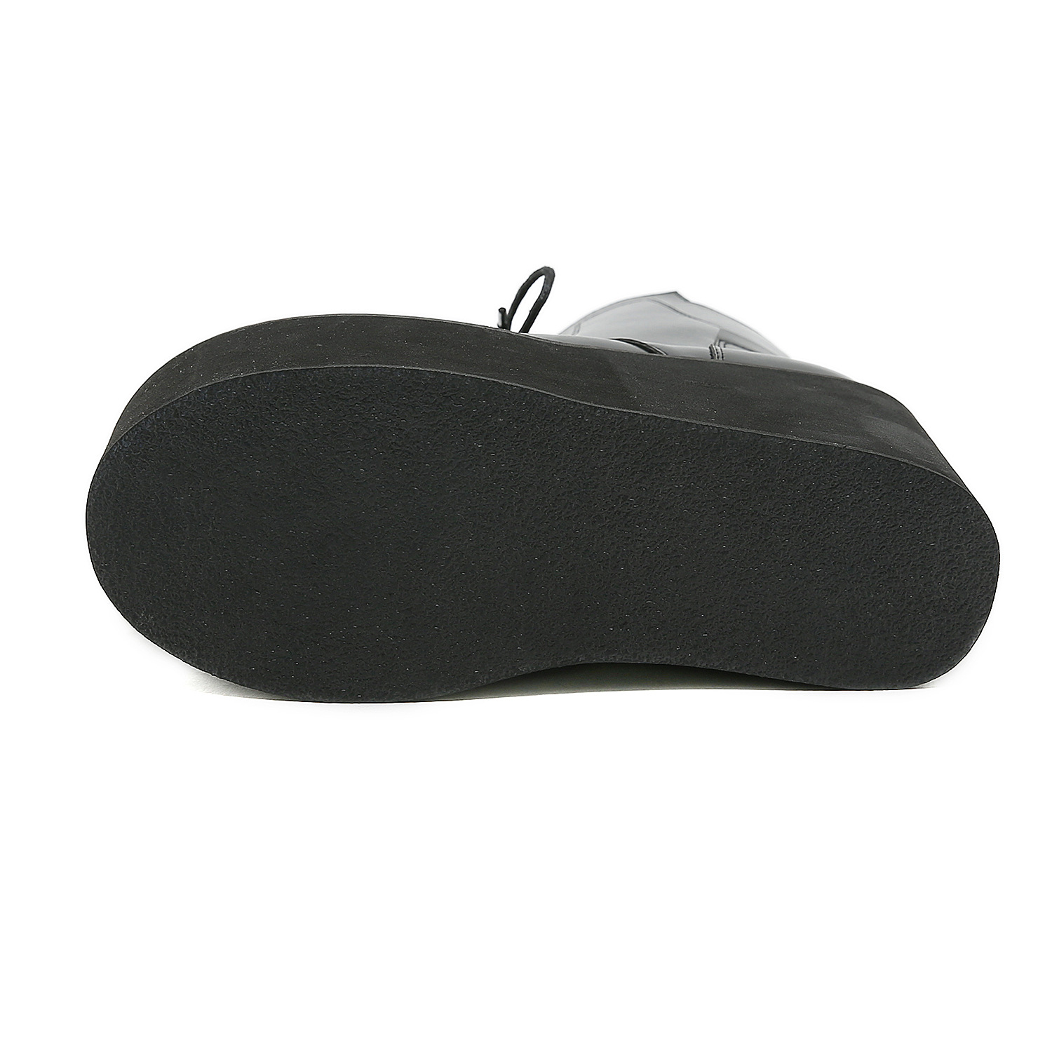 光沢のある合成革素材が高級感を演出し、編み上げデザインがスタイリッシュな印象を与えます。