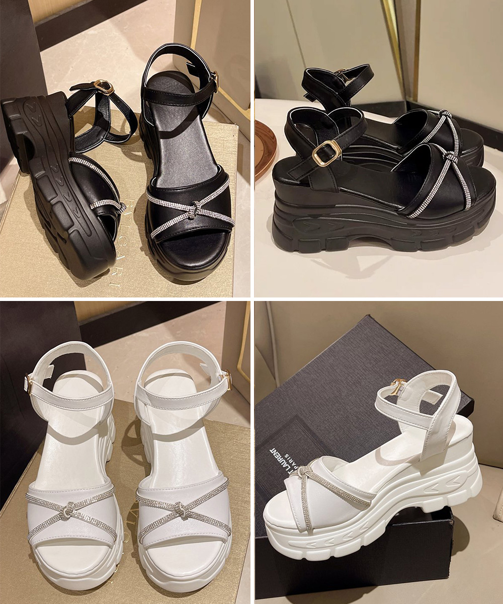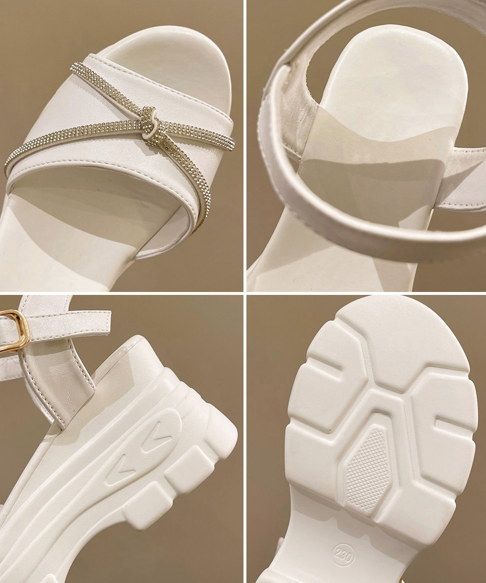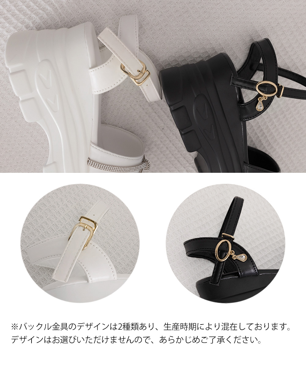 足首をしっかり固定するストラップで安定感が高く、7.5cm厚底で自然にスタイルアップ。