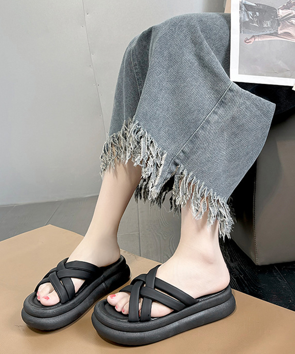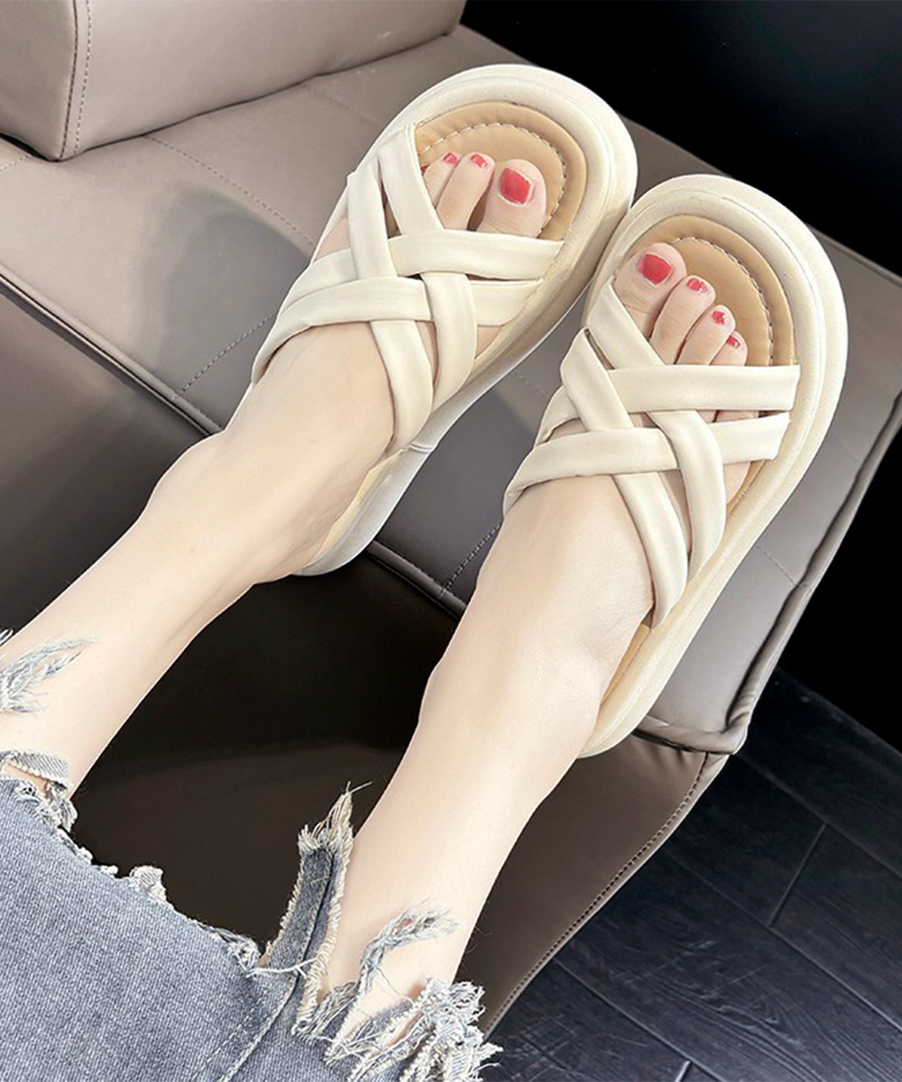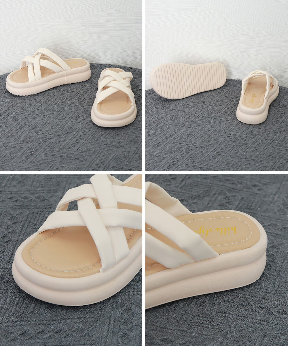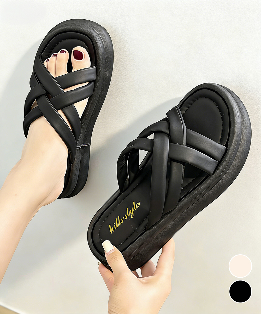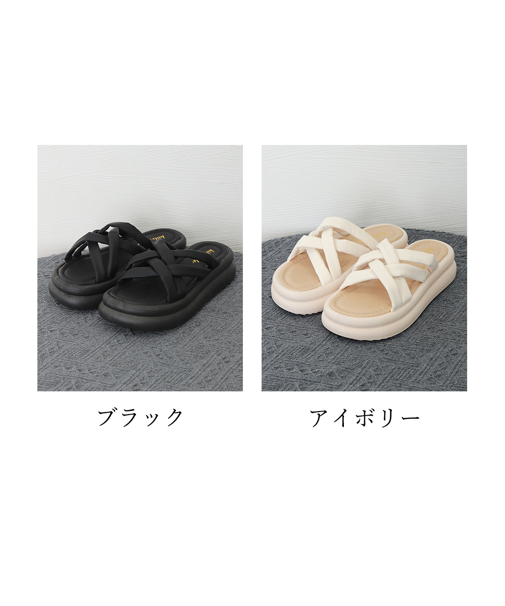 クロスベルトが印象的な厚底サンダルで、美脚効果抜群の夏の必需品。