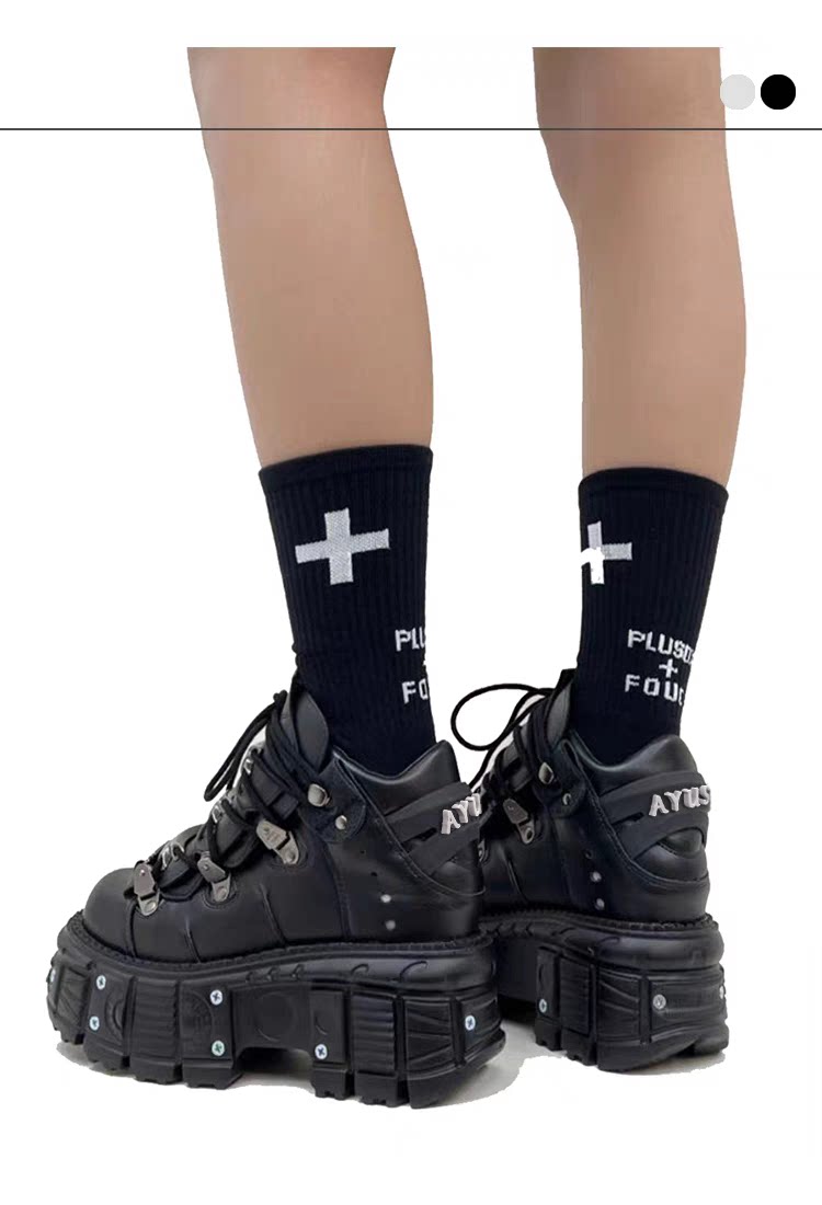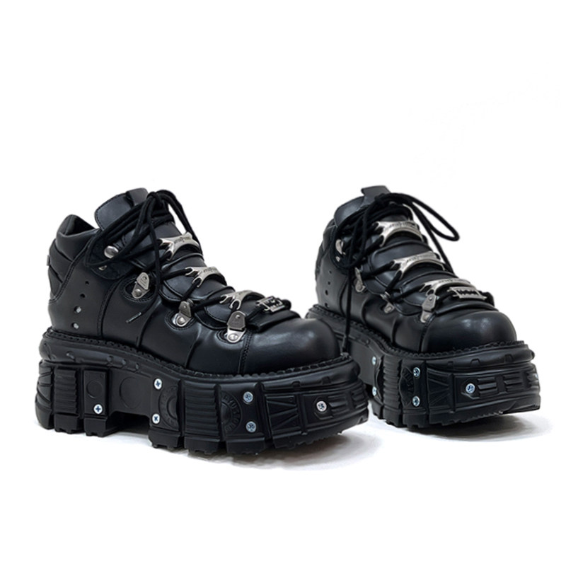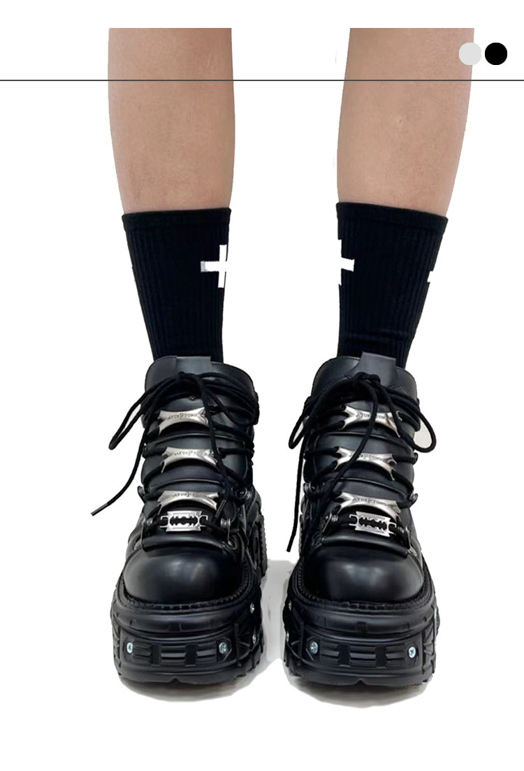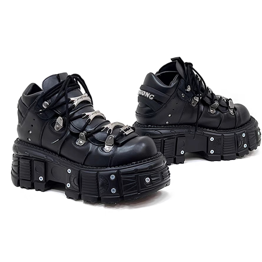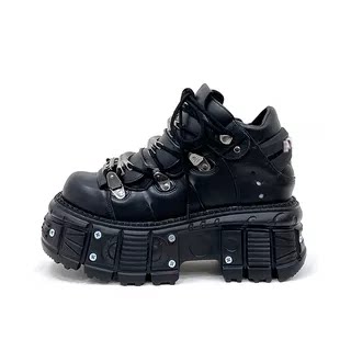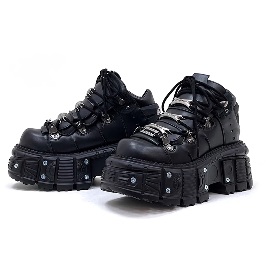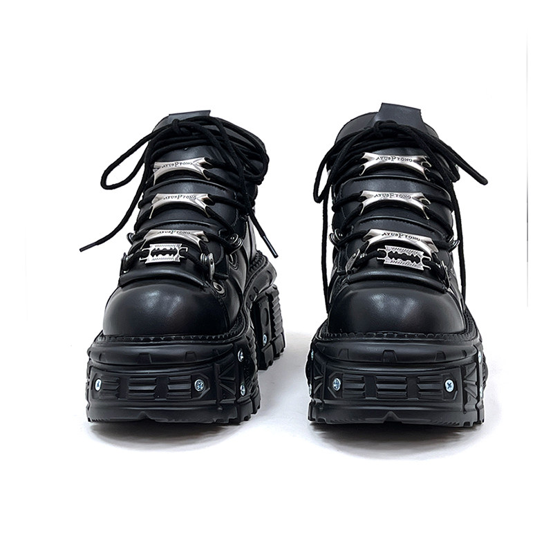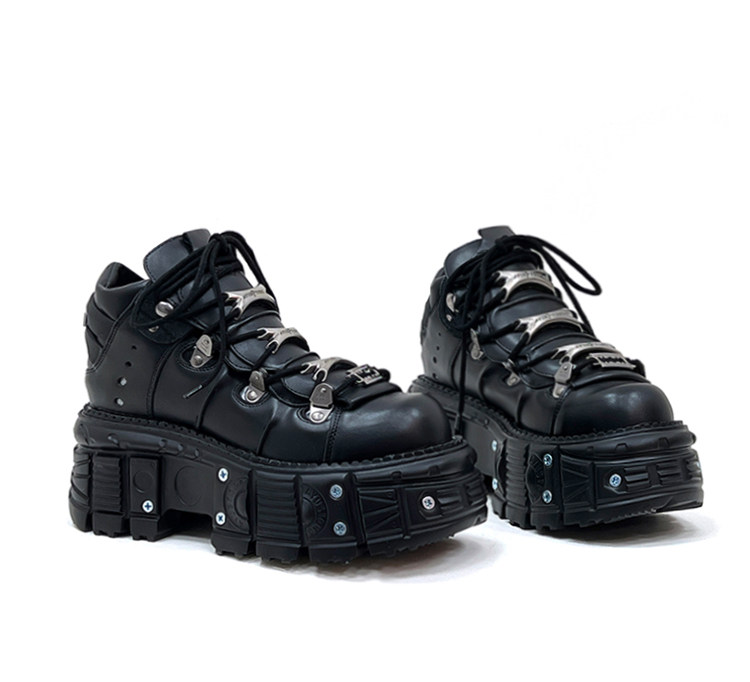 金属製のアイレットとチェーン風の装飾が施されたアッパーデザインが特徴的で、ロックテイストな雰囲気を演出します。